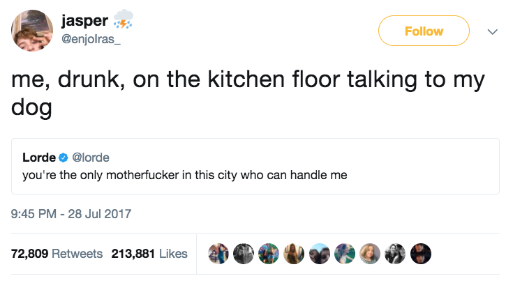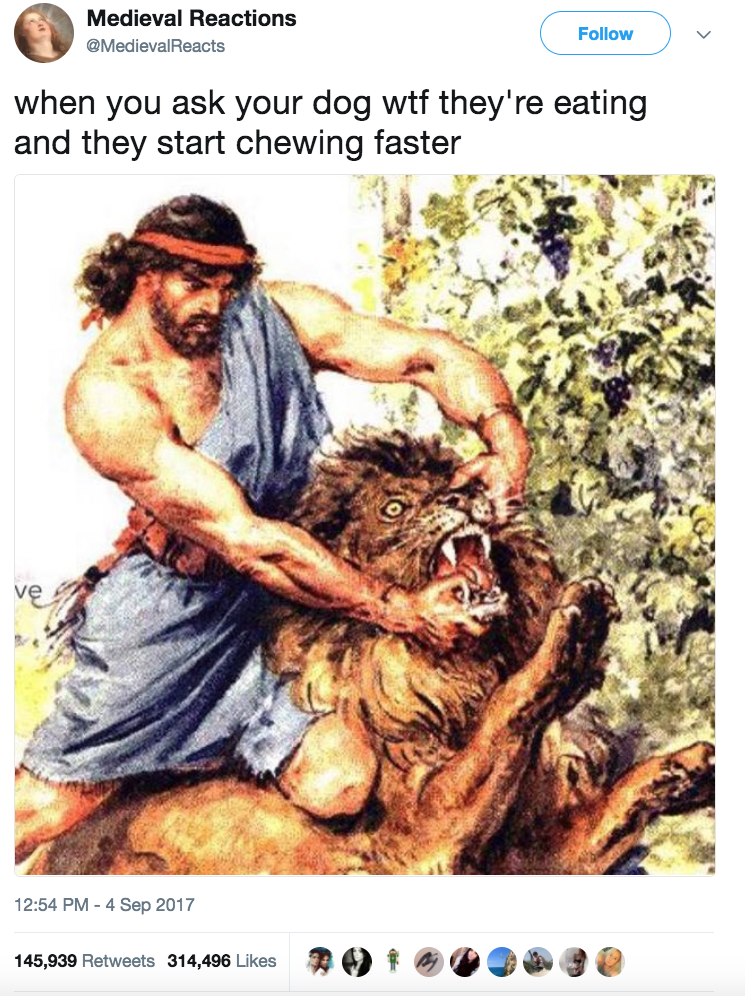 Employer: "So why do you want a job here?" Me: "So I can provide for my dog." 1. Twitter: @sadgirlkms 2. Twitter: @MedievalReacts 3. Twitter: @enjoIras_ 4. Twitter: @lilghosthands 5. Twitter: @holyfag 6. Stephquees Got The Sauce@Stephquees Teacher: Why are you late today?Me: My dog wouldn’t let me get out of bed... 5:14 PM - Sep 2, 2017 1,1781,178 Replies 106,684106,684 Retweets 187,915187,915 likes 7. Twitter: @ahmedtwinkie 8. Twitter: @hels 9. Twitter: @taylorndean 10. Twitter: @veganshorty 11. Twitter: @longwall26 12. Twitter: @dogtextings 13. Twitter: @loyalgaI 14. Twitter: @david8hughes 15. Alan White ✔@aljwhite My favourite subset of internet video is dogs that think their owners are drowning and this one is gold 12:11 PM - Aug 6, 2017 1,0551,055 Replies 43,12943,129 Retweets 94,14494,144 likes 16. Sam Melby@greeneggsnSam12 Owner: *pretends to throw ball*Dog: *runs after it, comes back*Owner: *takes ball from behind his back*Dog: 5:58 PM - Feb 24, 2017 2323 Replies 1,0041,004 Retweets 1,7551,755 likes 17. Twitter: @datassque 18. Twitter: @granitetide 19. Baby Animals@BBAnimals Dog tries to imitate little girl's cartwheel 10:00 AM - Aug 22, 2017 3939 Replies 2,2232,223 Retweets 4,2904,290 likes 20. Twitter: @ErrenMichaels 21. Twitter: @paetonmathes 22. Twitter: @Iolitatbh 23. Twitter: @deeeameddie Posted on September 30, 2017, at 11:46 a.m. Written by: Kat Angus BuzzFeed Staff, Canada Source: https://www.buzzfeed.com/h2/vflt/katangus/tweets-for-dog-owners?utm_term=.kk7BeOOKq#.wrqeAww4x